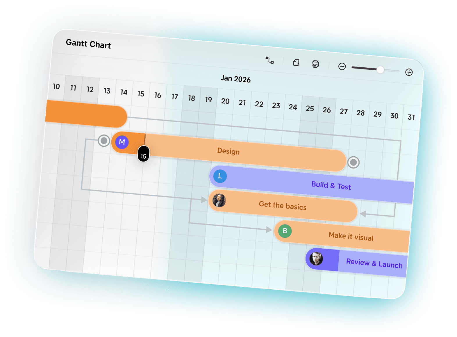 Break work down with AI, plan with real working days, and connect tasks faster with an enhanced Gantt chart — ready to export or print when needed.