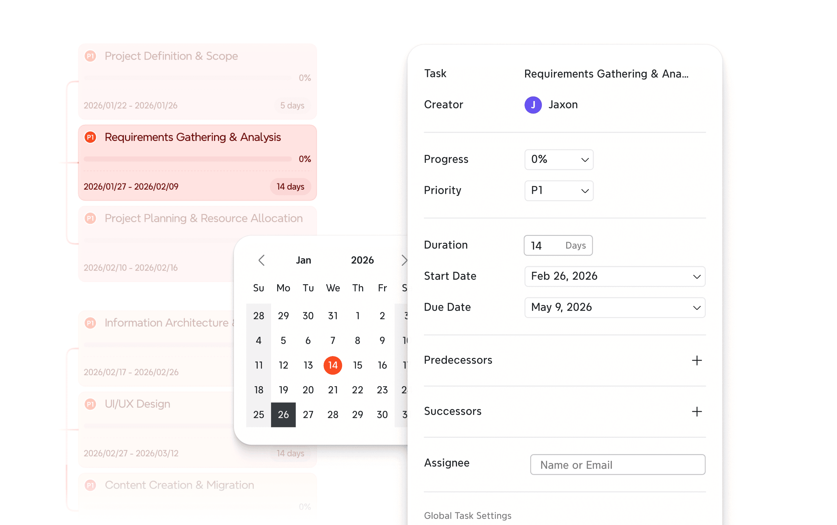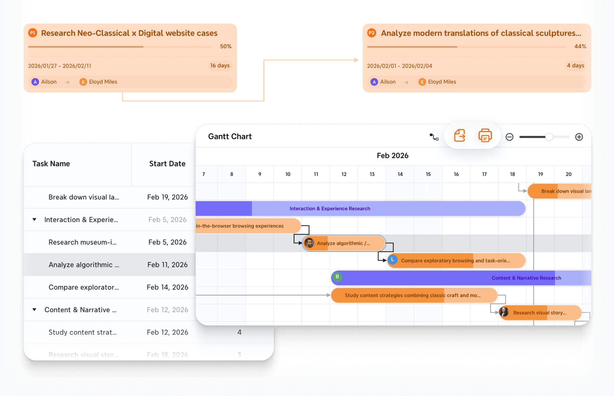 Link multiple tasks in one click, and export share-ready Gantt charts. Manage your project timeline from idea to delivery — clearly, efficiently.