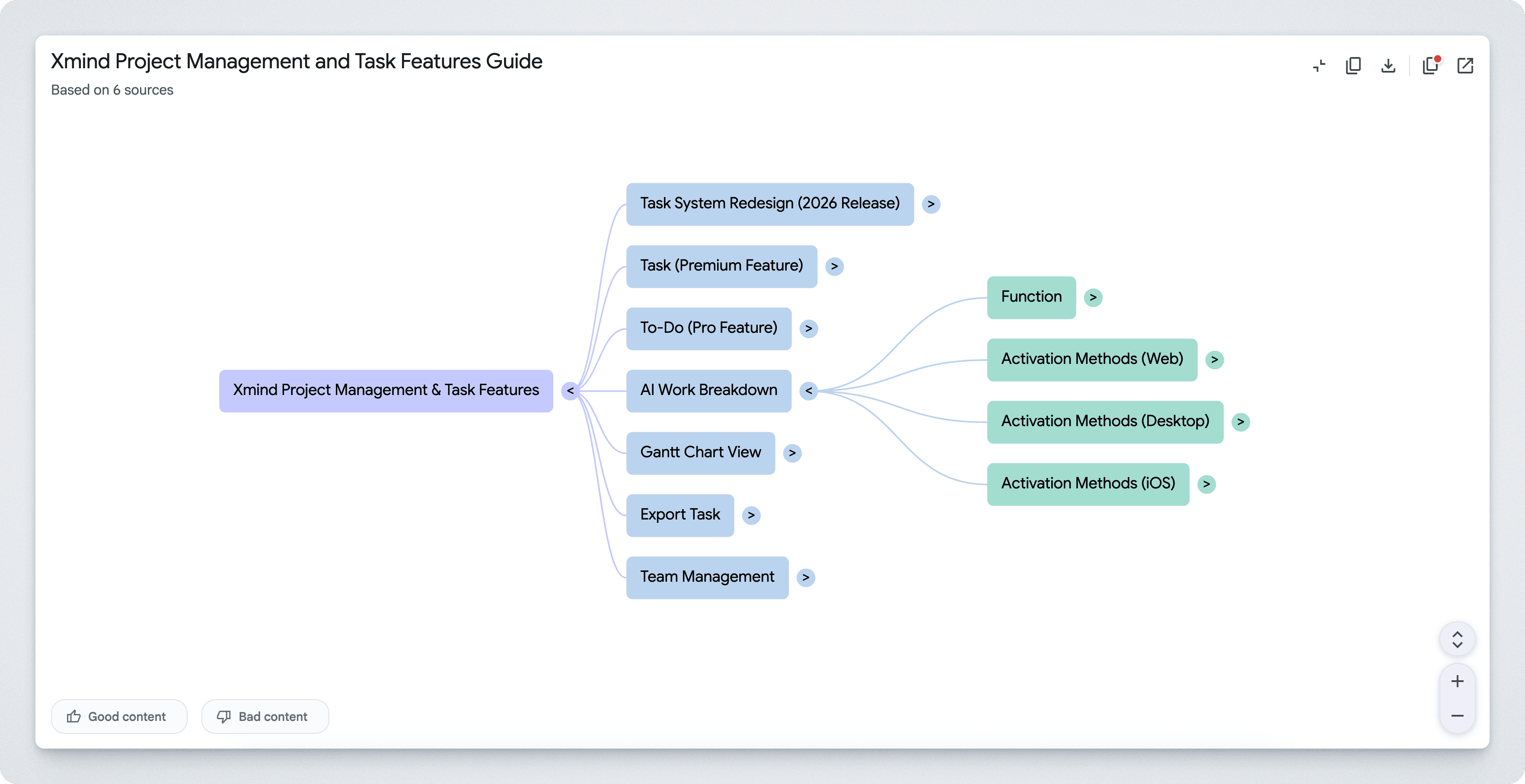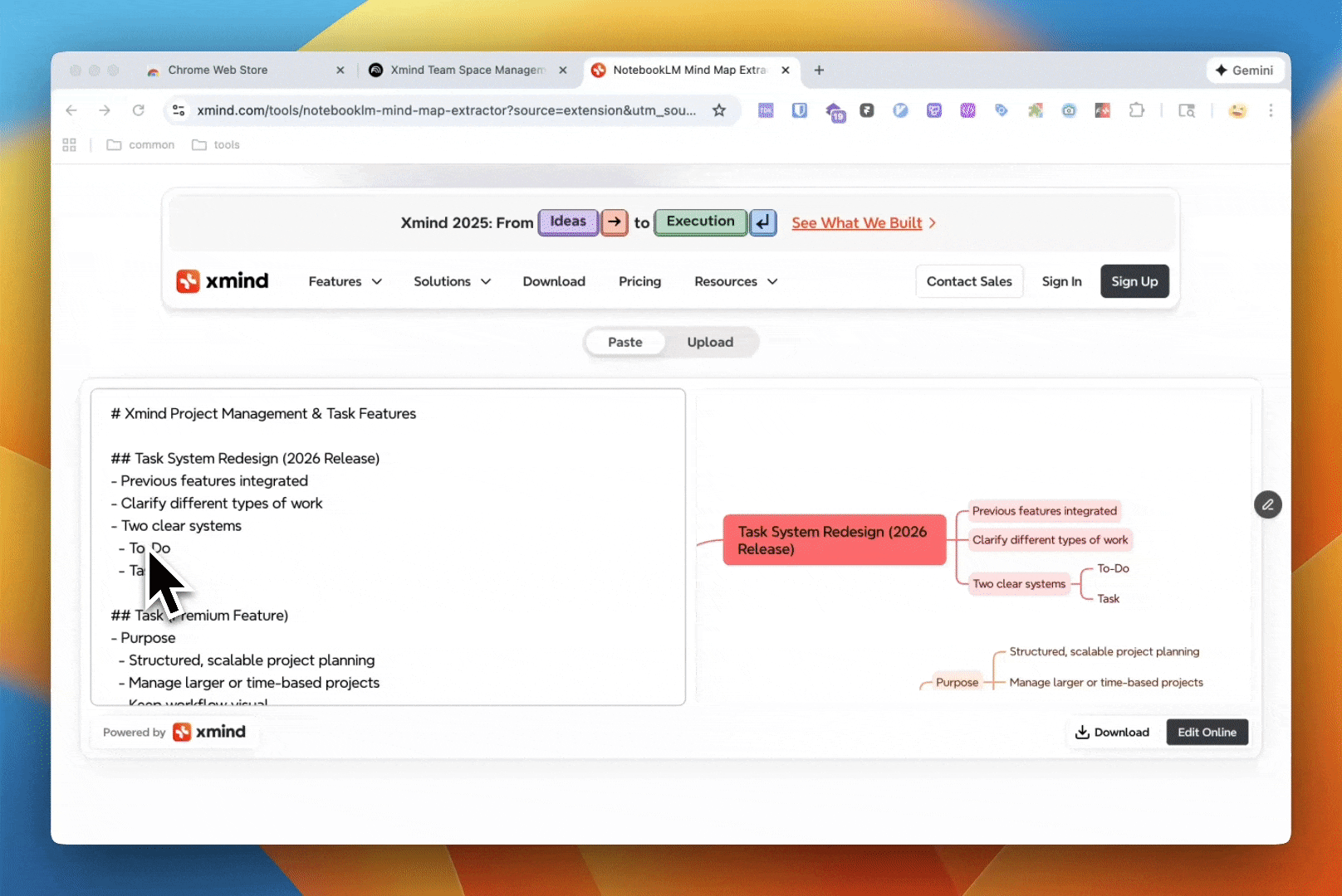 Нажмите Редактировать в Xmind, чтобы экспортировать вашу карту ума из NotebookLM за один шаг—оно автоматически разворачивает полную структуру, извлекает полный Markdown и открывает онлайн редактор с уже вставленным Markdown, так что вы можете начать редактирование немедленно на странице извлечения карты ума notebooklm.