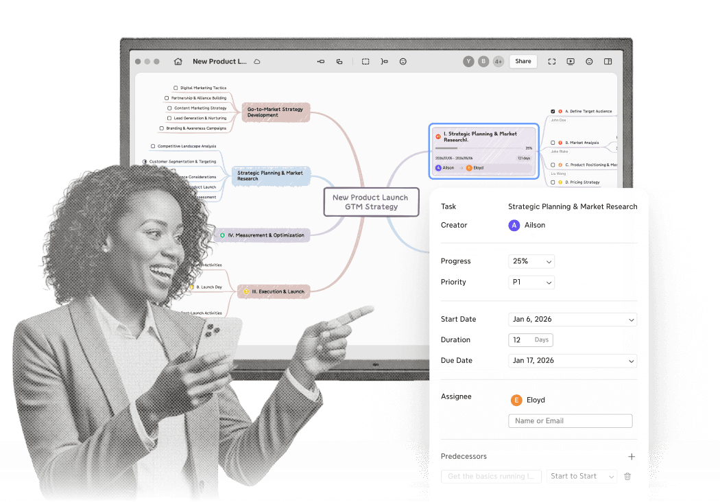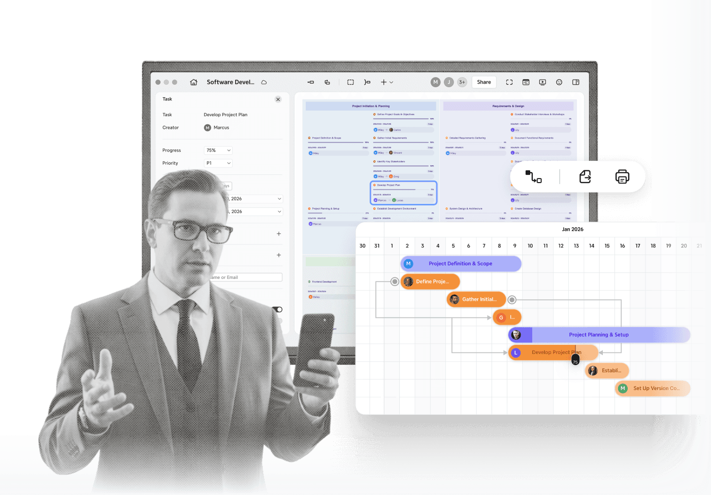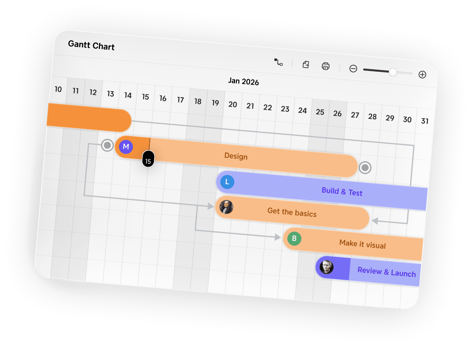 Turn ideas into execution. Track accurate timelines with Skip Non-Working Days in Gantt Chart, and keep teams aligned via Export & Print.