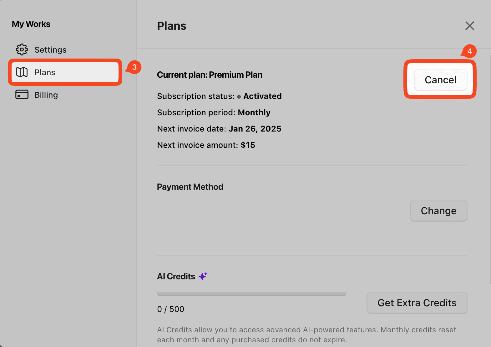 在方案頁面上,找到取消按鈕並點擊它以關閉自動續訂。