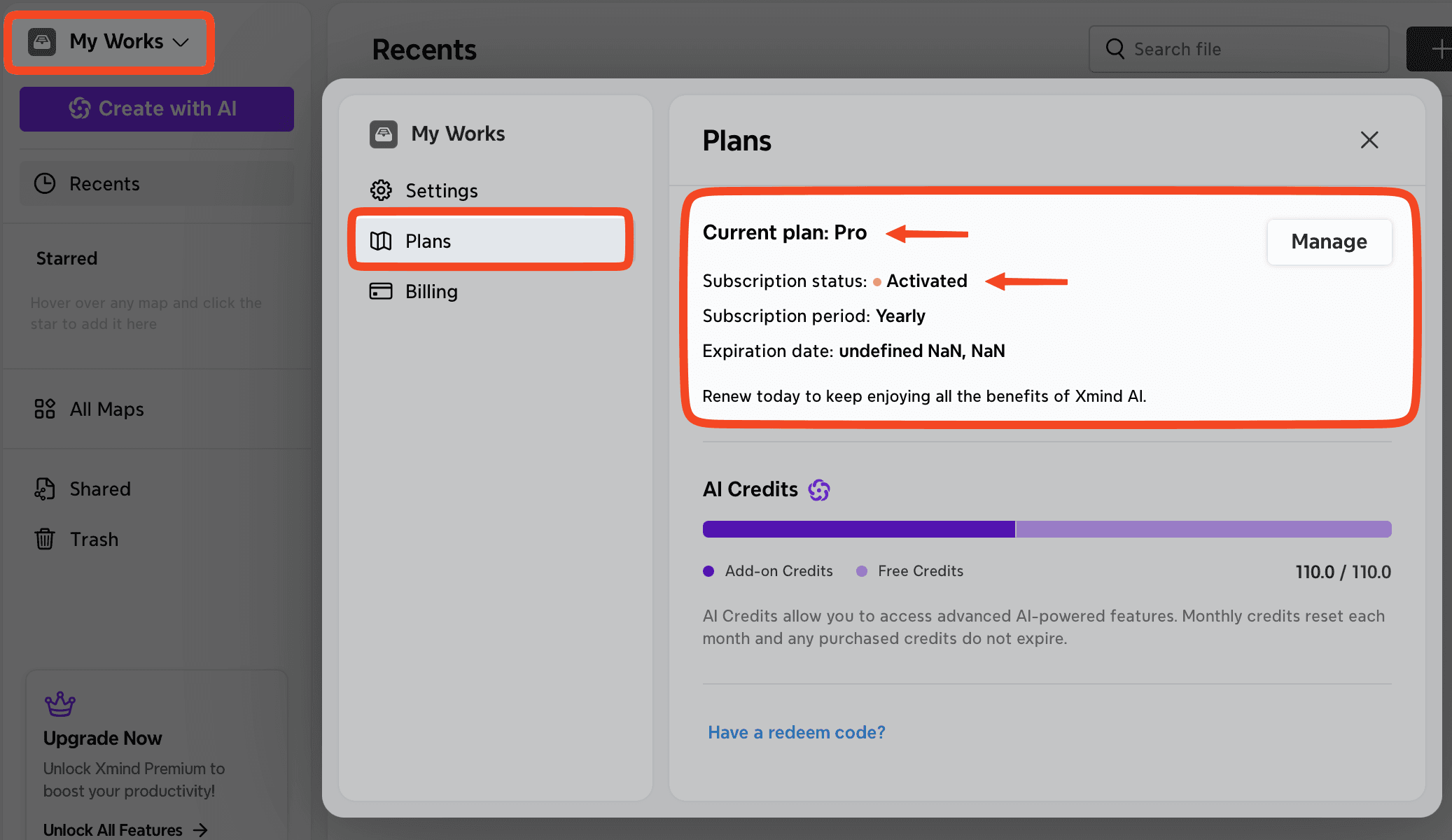 擁有 Xmind Pro 訂閱時,如果您將檔案上傳到 我的作品 或 團隊空間,某些功能將保持鎖定,除非您升級到 Xmind Premium 或 Xmind Business。