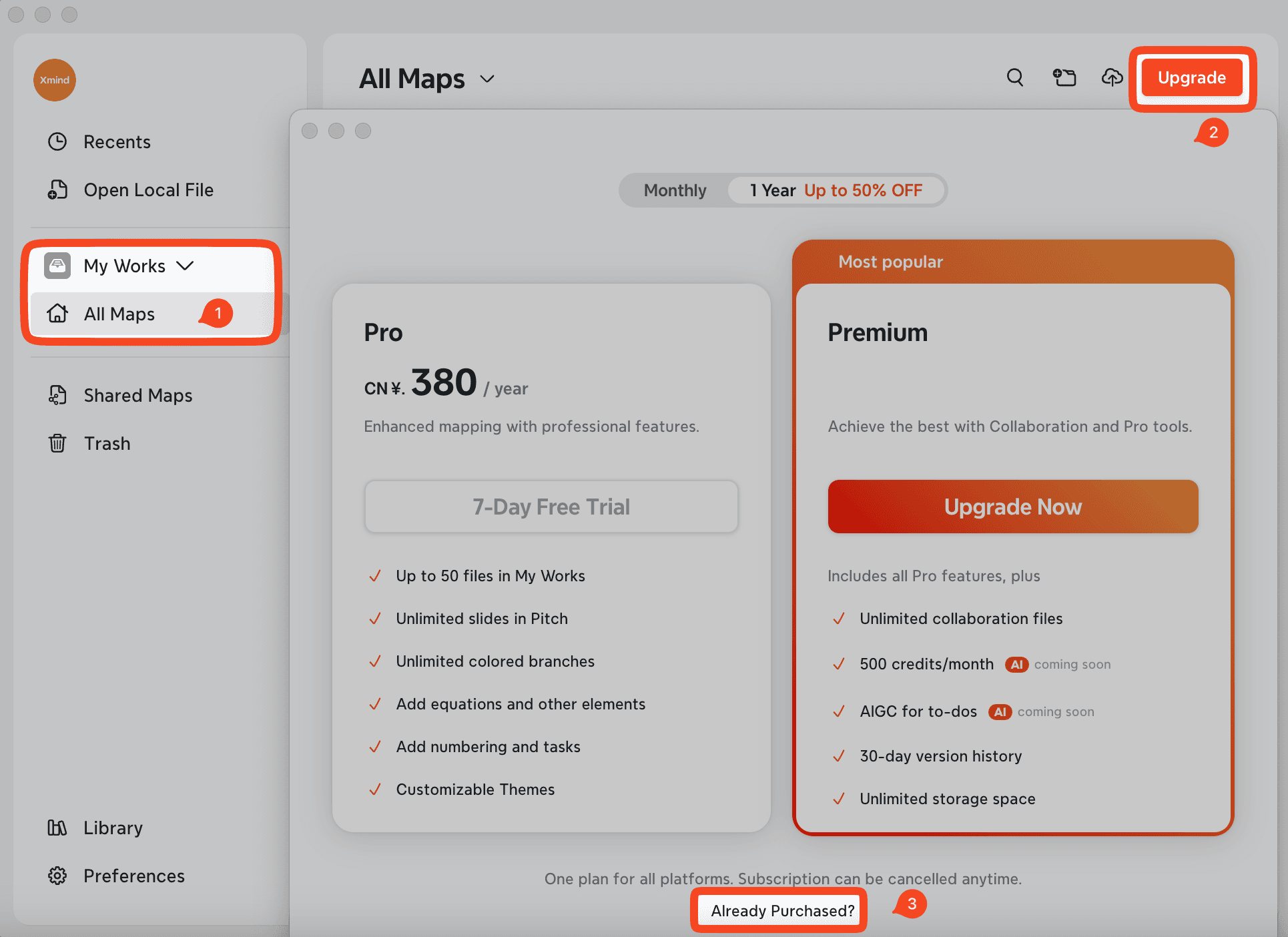 如果您有活躍的 Pro 或 Premium 計劃但功能依然鎖定,請在 Xmind 應用中登出並重新登入您的帳戶。