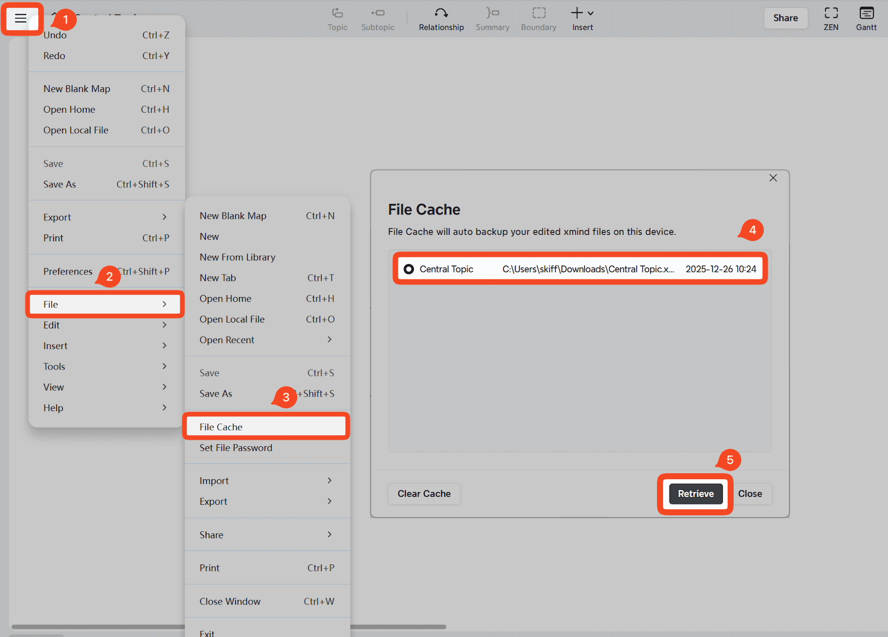 如果您的心智圖是使用Xmind for Desktop創建並本地保存的,您可以通過文件緩存功能來恢復它們。