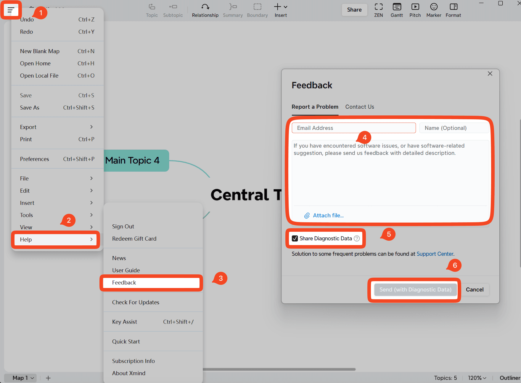 如果您在使用 Xmind 時遇到問題,請直接從您正在使用的應用程式提交反饋。這樣我們可以接收到診斷數據,更好地了解問題。
